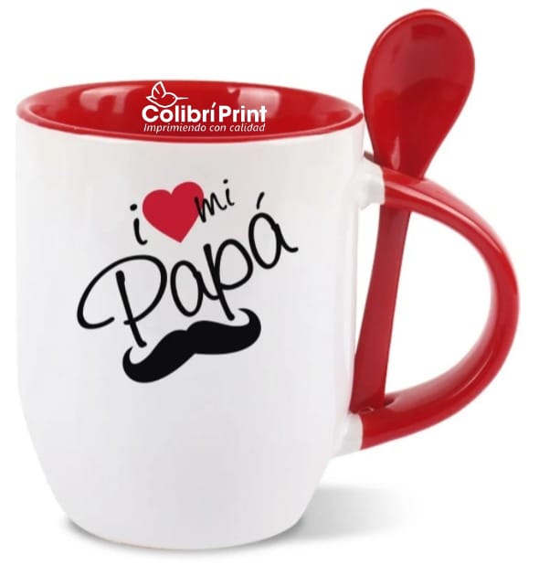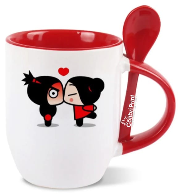 Taza blanca, interior de color rojo /cuchara
